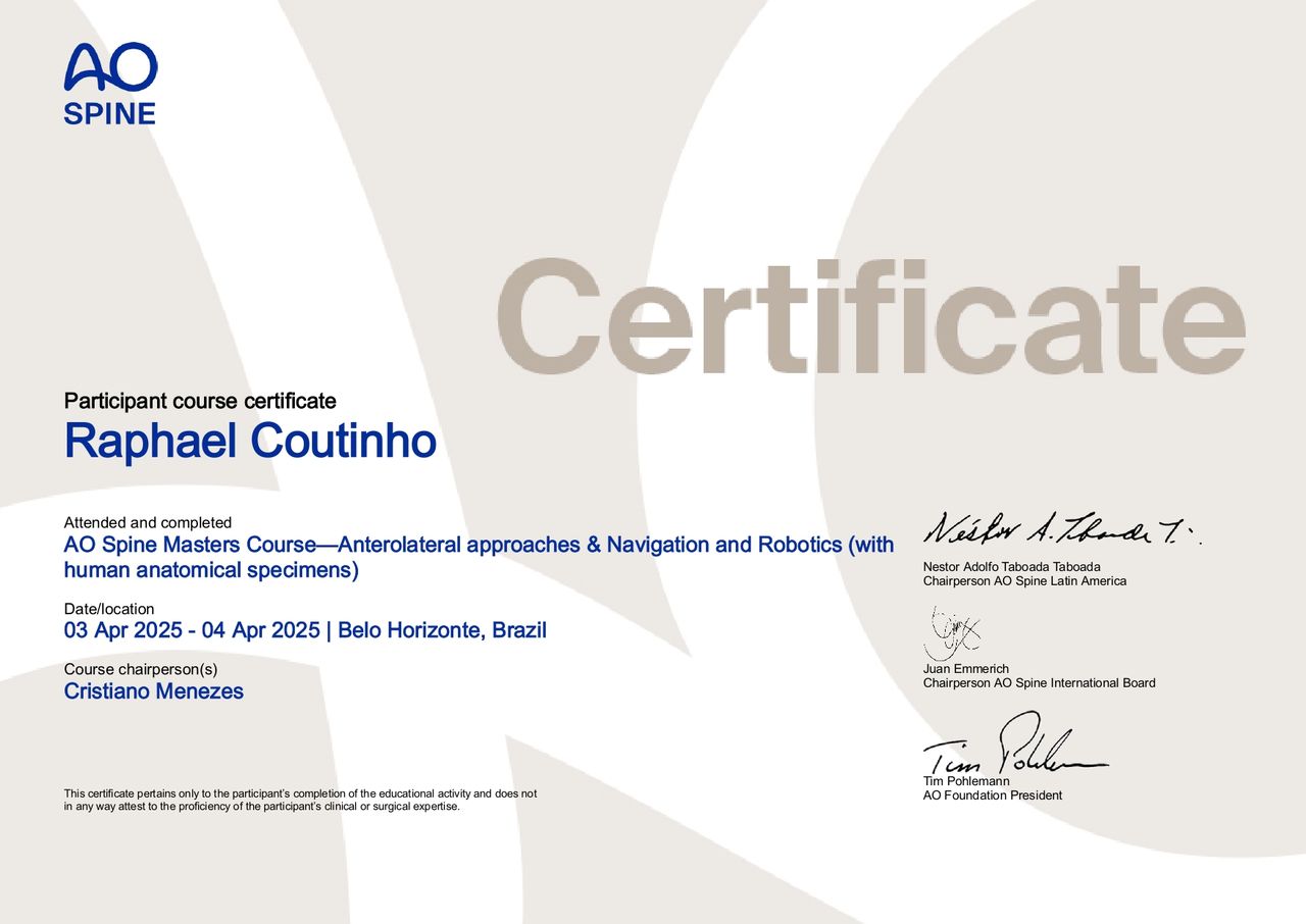 Profissional com excelente formação acadêmica, graduação em medicina pela Universidade de Uberaba ( UNIUBE ); residência médica em Neurocirurgia, com título de especialista pelo Instituto de Previdência dos Servidores do Estado de Minas Gerais ( IPSEMG ) BH-MG; residência médica em Cirurgia da Coluna Vertebral no Hospital Madre Teresa, em Belo Horizonte MG, com título de especialista pela Pontifícia Universidade Católica ( PUC MG ).
